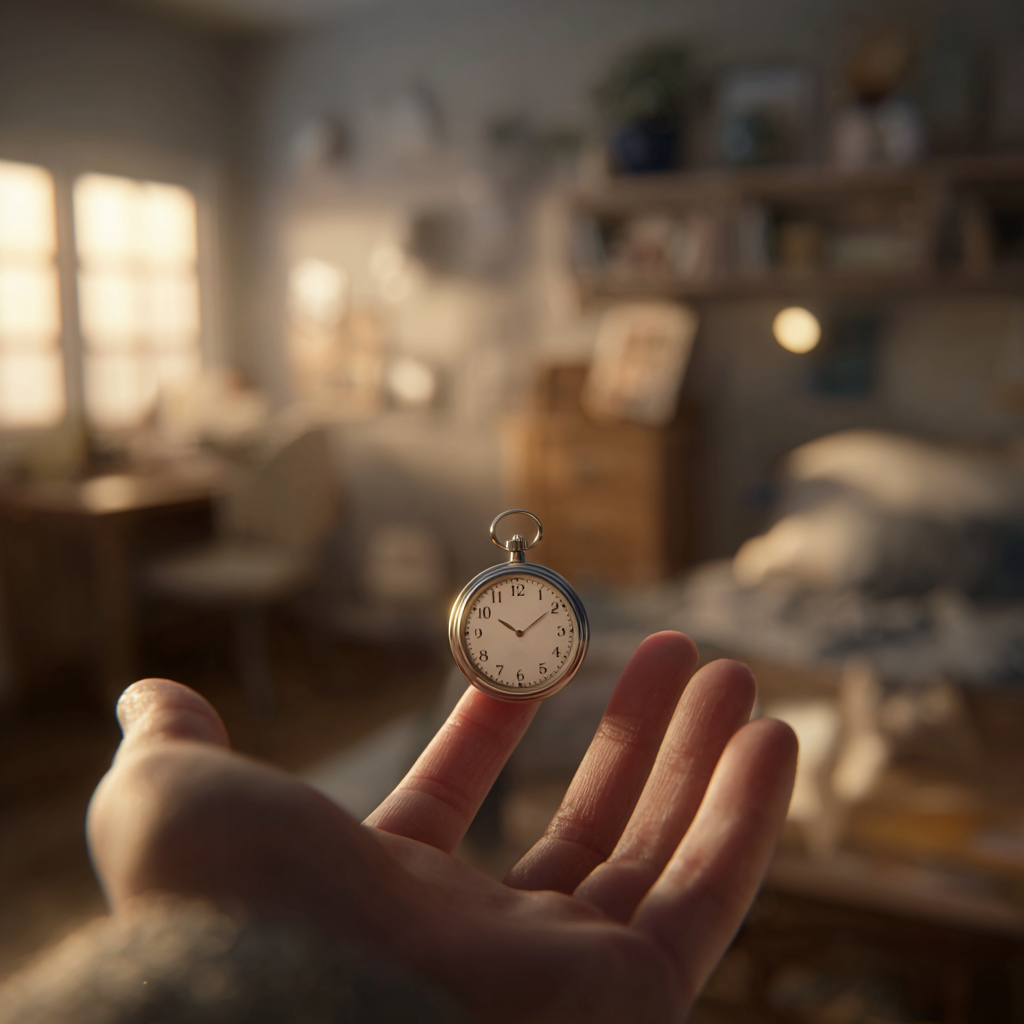 (레퍼런스와) 같은 손가락 사이로 집은 작은 시계 → (레퍼런스의) 작은 시계를 신비로운 기운을 내뿜는 아주작은 하트모양 유리구슬로 바꿔줘